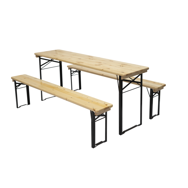 Universell einsetzbare Biertischgarnitur bestehend aus einem Tisch in 3 verschiedenen Größen und 2 dazugehörigen Sitzbänken.